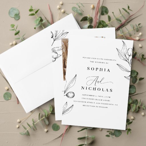 Maak uw grote dag bekend met tijdloze elegantie met behulp van deze minimalistische Save the Date kaart. Ontworpen met strakke typografie in zwart en wit, een delicate illustratie van een olijftak en ruimte voor uw favoriete verlovingsfoto, combineert het eenvoud met natuurlijke schoonheid. Perfect voor koppels die van een subtiele stijl houden. Dit ontwerp is ook ideaal voor mediterrane, Italiaanse of Toscaanse bruiloften, waarbij de olijftak symbool staat voor vrede, liefde en erfgoed. Beschikbaar als gedrukte kaart of handig digitaal downloadbestand.