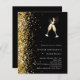 Voor een Vrijgezellenfeest. Een zwarte achtergrond. Versierd met faux gouden glitter en een paar fluiten. Personaliseer en voeg een naam en feestdetails toe. 1 vel = 1 uitnodiging afgedrukt rand tot rand.