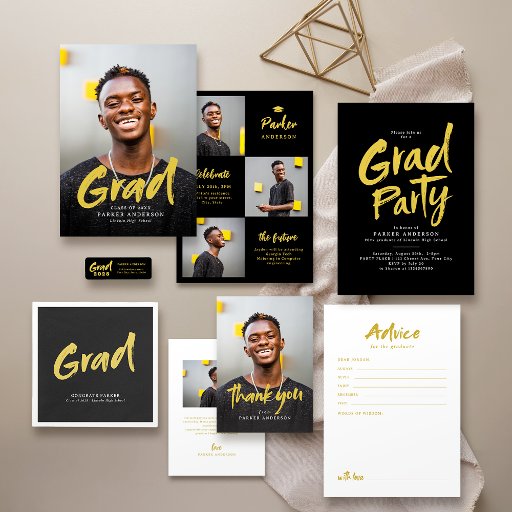 Modern penseelscript mini size Afstuderen Aankondiging met foto in zwart en goud, eenvoudig en uniek. Pas het aan met uw eigen foto's en afstudeerder feestinformatie.