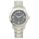 Dit vrouwenhorloge heeft een modern design van een kleine ovaal in een grotere ovaal op een zwart veld.