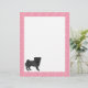 Destei's originele cartoon illustratie van een schattige zwarte vachtkleur Pug rashond. De middelste achtergrondkleur is wit, ideaal voor het schrijven van notities, terwijl de randkleur roze is met een patroon van roze hartvormen in verschillende maten.