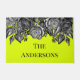 Deze cool uitziende welkomstmat is klaar om te worden gepersonaliseerd met de naam van uw familie of elke tekst die u wilt. Deze deurmat is voorzien van illustraties van zwarte en witte rozen in een antiek graveerstijl, geplaatst tegen een felle electrische lime groene achtergrond.
