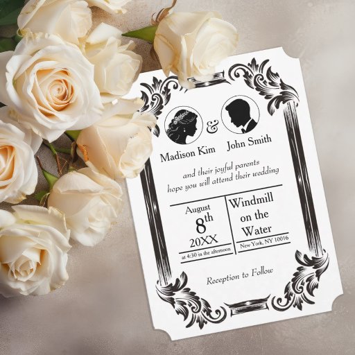 Elegante zwart-witte huwelijksuitnodiging met silhouetten van een man en een vrouw tegenover elkaar. Het ontwerp bevat ook een stijlvolle kalligrafie met gedurfde typografie.