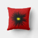 Dit werpt een kussen met een dramatisch abstract ontwerp van een zwarte bloem met een gouden gele kern op een rode achtergrond. Het afbeelding wordt op de achterkant herhaald.