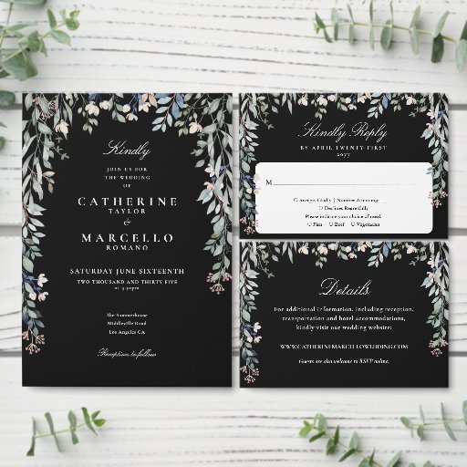 Een elegante, alles-in-één driezijdige trouwuitnodiging met jouw speciale foto, monogram- initials en een cascade van wilde bloemen op een zwarte achtergrond. De uitnodiging bevat informatie voor je feestgasten en een afneembare RSVP kaart. Ontworpen door Thisisnotme©