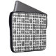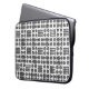 Een zeer chique neopreen laptophoes, met een patroon van traditionele Welshe tapijtmotieven in zwart op een witte achtergrond.