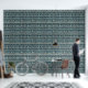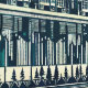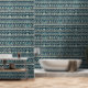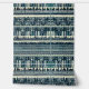 Een gedetailleerd zwart-wit geometrisch ontwerp met rijen bomen, huizen en abstracte vormen. Dit ingewikkelde patroon creëer heeft een moderne maar natuurlijke esthetiek, ideaal voor huisdecoratie of textiel.