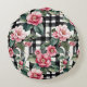 Zwart-wit geplakt met bladerige roze camelia's rond kussen
