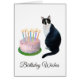 Een zwarte en witte kat met een verjaardagstaart blaast met kaarsen. Stuur deze elegante verjaardagskaart naar een kattenliefhebber.