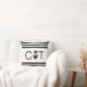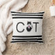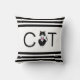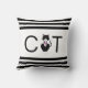 Wilde kat met zwart-wit tuxedo jasje op zwart-wit gestreepte sierkussen.