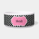 Stijlvol hondengerecht gemaakt met een zwarte en witte poka stip band, rond het gerecht, en een roze decoratieve tekstruimte, in het midden voor de naam van je huisdier. Met een gefingeerde zwarte aangepaste tekst kunt u de naam van uw huisdier aanpassen, zodat uw hond trots kan zijn op een gepersonaliseerde kom. Het maakt een geweldig cadeauidee.