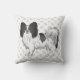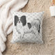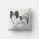 Destei's originele cartoon illustratie van een zwarte en witte vacht met de kleur Papillon-rasshond. De achtergrond heeft een patroon van grijze hondenpootafdrukken. De grijze kleur van het afdrukpatroon van de hondenpoot kan indien gewenst worden gewijzigd in een andere kleur.