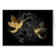 Zwarte en gouden sieraden kolibries op grijze achtergrond versierd met planten. Sieraden vogels. Gouden vogel. Gouden vogel.