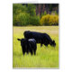 Dit is land! Twee zwarte hoeken grazen samen in een veld van groot, vibraneus geel groen gras, met een dikke laag bomen op de achtergrond in soortgelijke schoppen.