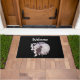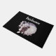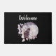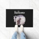Welkom deurmat met een waterverf schilderij van een zwarte kat en een lichte paarse en roze bloemboquet. Voor een grote volle maan staan. Stijlvol en magisch.