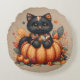 Zwarte kat op pompoen met herfst quilt patroon rond kussen