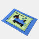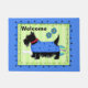Show dat je hond van deze schotel houdt, een welkome deur voor je thuis of op je werk. Het woord "welkom" kan aan een ander woord of een andere naam worden gepersonaliseerd. Dit tapijt is voorzien van een zwarte Scottie Terrier die een blauwe sweater mantel draagt met tonale blauwe sterren en een rode kraag. Een kalkgroene en turkooisbal ligt achter de Scottie en een groot wit hondenbot staat aan zijn of haar voorpoot. De achtergrond is een kalk groen tonaal stripe patroon. Een serpentine lijn grens omringt het afbeelding van de hond om een stijlvolle, trendy en aangepast decoratieve Schotse schrikbarende hondenkunst te maken. Drie turquoise blauwgroen blauwe bloemen boven de hond. De kunst staat op een blauwe achtergrond. Deze schattige, knuffelende en trendy hond is originele kunst van Phyllis Dobbs en zal het hart van een hondenliefhebber smelten. Deze Scottie is één van een reeks van zes Scotties en iedereen is volledig aanpasbaar om het uw te maken! Coördinaat met overeenstemmende producten.
