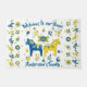 Dit portret heeft een Zweeds folk dala paard in het midden met een klassieke folk-kunstbloem in de Zweedse vlag blauw en geel. Aan de rand staan dezelfde paarden, roosters en varkens. U kunt het achtergrondpatroon op de deur kleiner of groter maken. Pas dit aan met uw eigen groet bovenaan en familienaam onderaan.