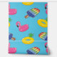 Versier uw poolhouse of voeg een zomerse touch toe aan uw volgende ambachtelijke project met deze schil met patroon en plakbehang. Mijn illustraties van een assortiment opblaasbare zwembaddrijvers in heldere zomerse kleuren zijn geplaatst tegen een heldere zwembadblauwe achtergrond.