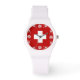 U hoeft zich nooit zorgen te maken over een afspraak met dit stijlvolle horloge met de heldere en vrolijke vlag van Zwitserland met een paar gestileerde edelweiss, een van de vele nationale Zwitserse Alpenbloemen. Of u nu op de skipistes bent of geniet van een welverdiende pauze met een van de heerlijke Zwitserse nationale gerechten die worden aangeboden in het Zwitserse chalet / restaurants, dit horloge zal zeker een aantal jaloerse opmerkingen trekken!